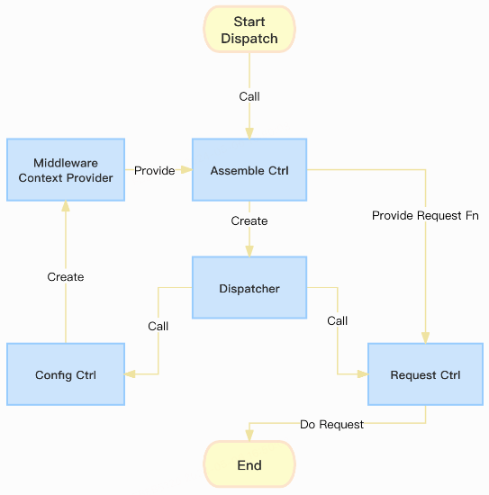 在装配控制器为核心的模式下,准备好一切条件,发起请求时调用请求控制器,请求控制器用于将组装好的请求函数(RequestFunction),结合中间件配置上下文以及初始请求配置生成 Context 后,执行请求。