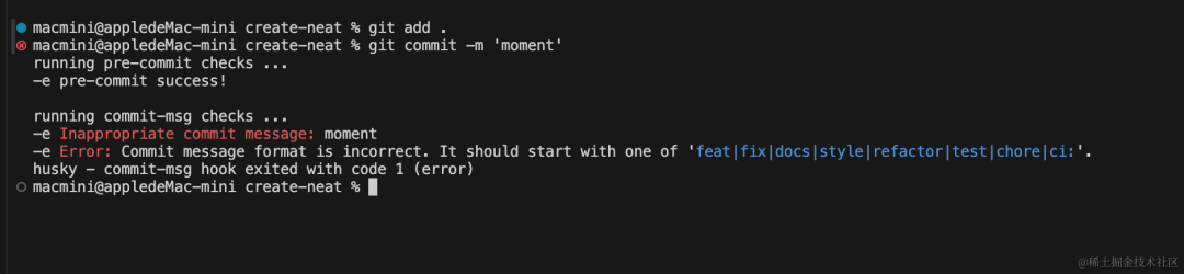 当我们输出了不合适的提交信息,它会报错,如下所示: