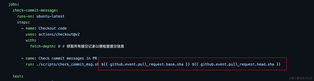 该脚本它接收两个参数,起始 SHA (start_sha) 和结束 SHA (end_sha)。这两个参数用于指定要检查的提交范围。这对于在 CI/CD 流程中检查一系列提交非常有用,如下图所示: