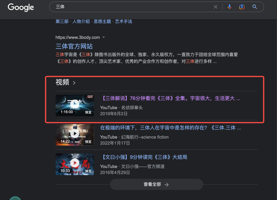 <script type="application/ld+json" id="scriptTag" nonce="-_vD_w5o44pwi2zXVWL8EA" class="style-scope ytd-player-microformat-renderer">{ "@context": "https://schema.org","@type": "VideoObject","description": "《三体》完整合集浓缩版,真.完结撒花!增加了一些内容,修正了一些内容,删除了一些内容。片尾有彩蛋嘿嘿~\n希望你们喜欢。\n\n#三体 #名侦探拳头 #科幻","duration": "PT4560S","embedUrl": "https://www.youtube.com/embed/QO25QnboJG0","interactionCount": "7714441","name": "【三体解说】76分钟看完《三体》全集。宇宙很大,生活更大。【名侦探拳头】","thumbnailUrl": [ "https://i.ytimg.com/vi/QO25QnboJG0/maxresdefault.jpg"] ,"uploadDate": "2019-06-02","genre": "People & Blogs","author": "名侦探拳头"}</script>除了谷歌的结构化数据外,我们在百度也会看到一些图文展现格式,在说明文字的左侧放上一张图片。