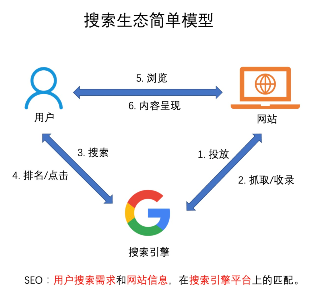 搜索引擎的工作流程主要涉及了 2 个角色——网站和搜索引擎,我们将第 3 个角色用户也加入其中后,就可以形成包含 3 个主要角色和 6 个核心环节的搜索生态模型。