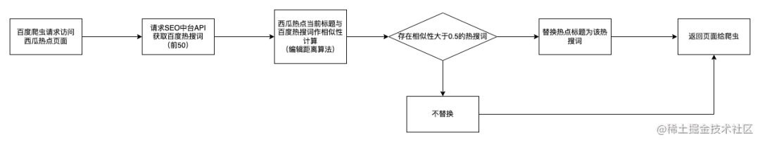 基于这样的推断,我思考能否通过将西瓜热点中与百度热搜词中相关联的内容进行联动,当百度爬虫爬取西瓜热点页面时,判断百度热搜词中是否有与该西瓜热点相近的内容,通过替换西瓜热点的标题来达到在百度搜索中提升排名的目的。