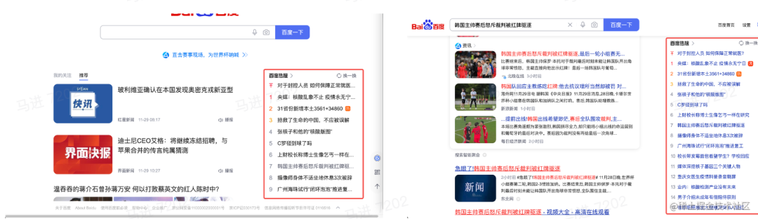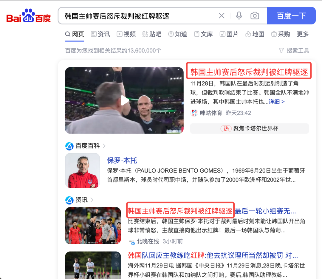 我们点击其中一个热点后,会进入该热点的搜索结果页,并且在搜索结果的最上方聚合展示有关该热点的相关资讯网页,可以发现网页标题中包含热搜词的页面的搜索结果往往会获得较高的排名,例如下图「韩国主帅赛后怒斥裁判被红牌驱逐」这个热搜词,我们能看到排名较前的几个搜索结果中都包含了该热搜词。
