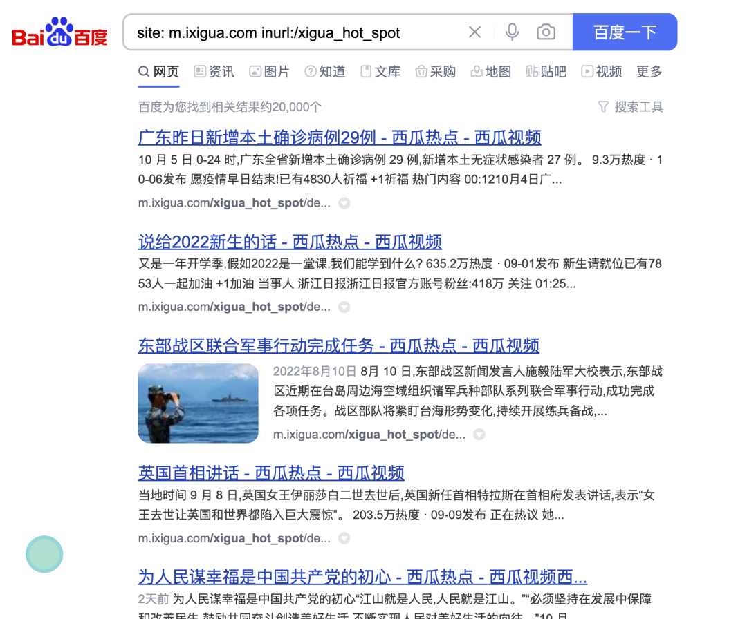 site: m.ixigua.com语句,可以查询索引的数据分页面的索引,使用
