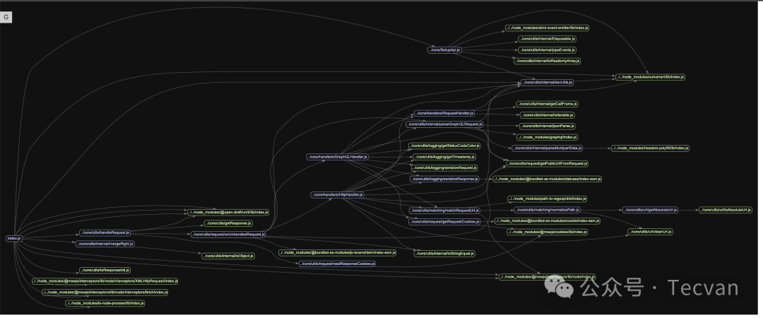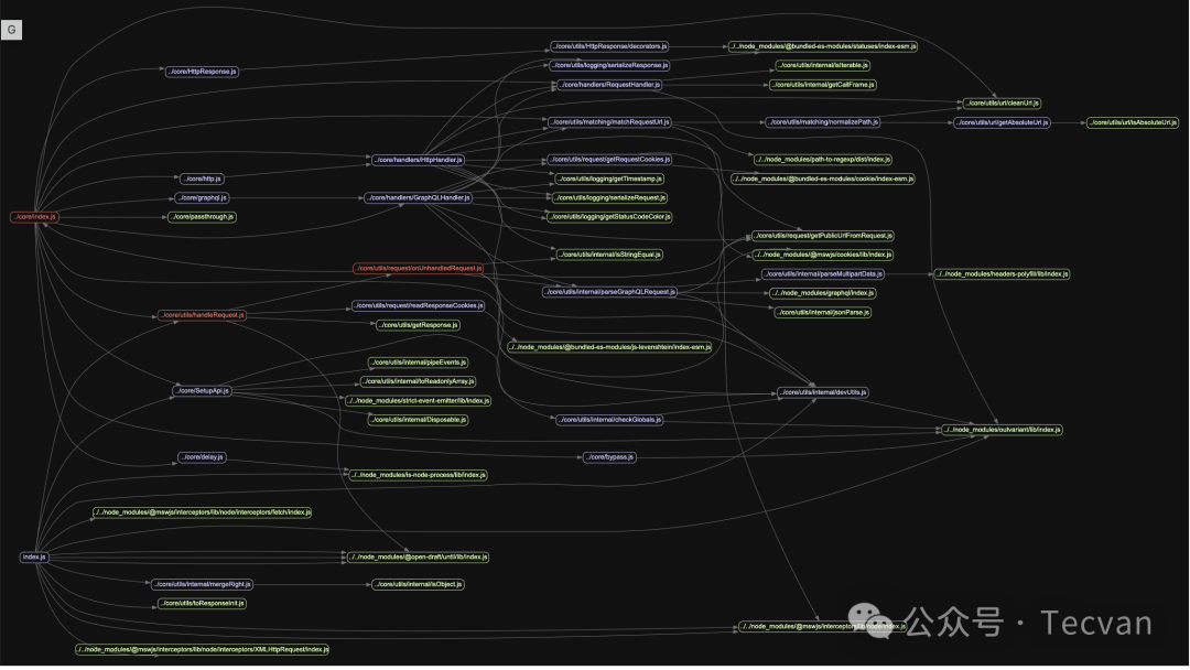 举个实际例子,开源工具 mswjs 曾经做过一次重构,移除仓库内部分 Barrel Files,重构之前模块之间的依赖关系: