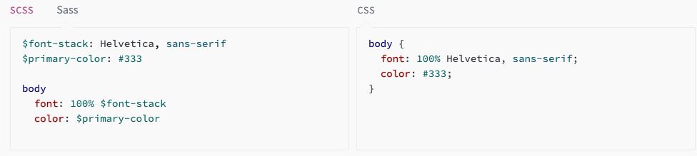 这里我们用到 SCSS(Sassy CSS)来实现这套体系。SASS 是 CSS 的预处理器,由 Ruby 编写。一开始并不支持 {} 和这种原生 CSS 的写法,缩进也严格控制,增加了开发者的使用成本。具体的区别可以看下面这张 gif 图。