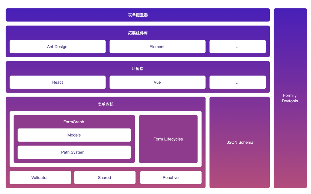 这张图主要将 Formily 分为了内核层,UI 桥接层,扩展组件层,和配置应用层。