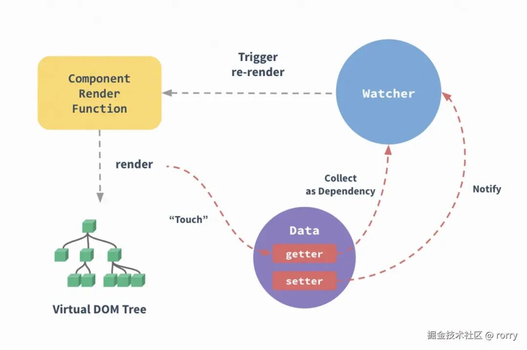 我们也能从下面这张图得到答案,这是 vue2 的响应式原理图,vue3 中通过 proxy 做代理,整体流程也差不多。和 Signal 相比都是访问时跟踪依赖、在变更时触发副作用的值容器。从根本上说,Signal 是与 Vue 中的 ref 相同的响应性基础类型,换句话说,Vue ref 也是 signal。