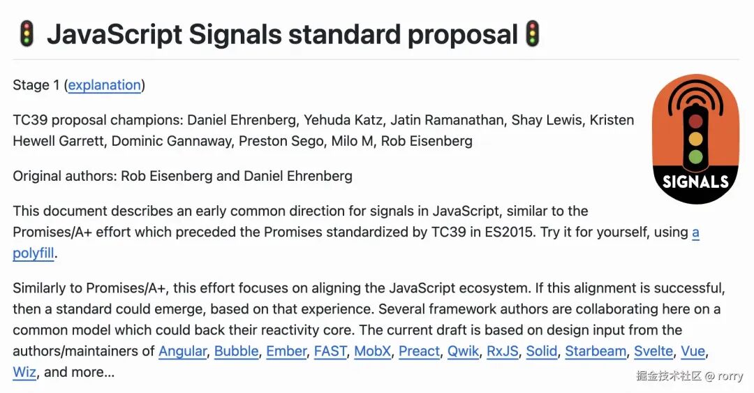 这是最新公开的 Signals TC39 提案内容,当前的草案基于 Angular、Bubble、Ember、FAST、MobX、Preact、Qwik、RxJS、Solid、Starbeam、Svelte、Vue、Wiz 等的作者 / 维护者的设计意见。