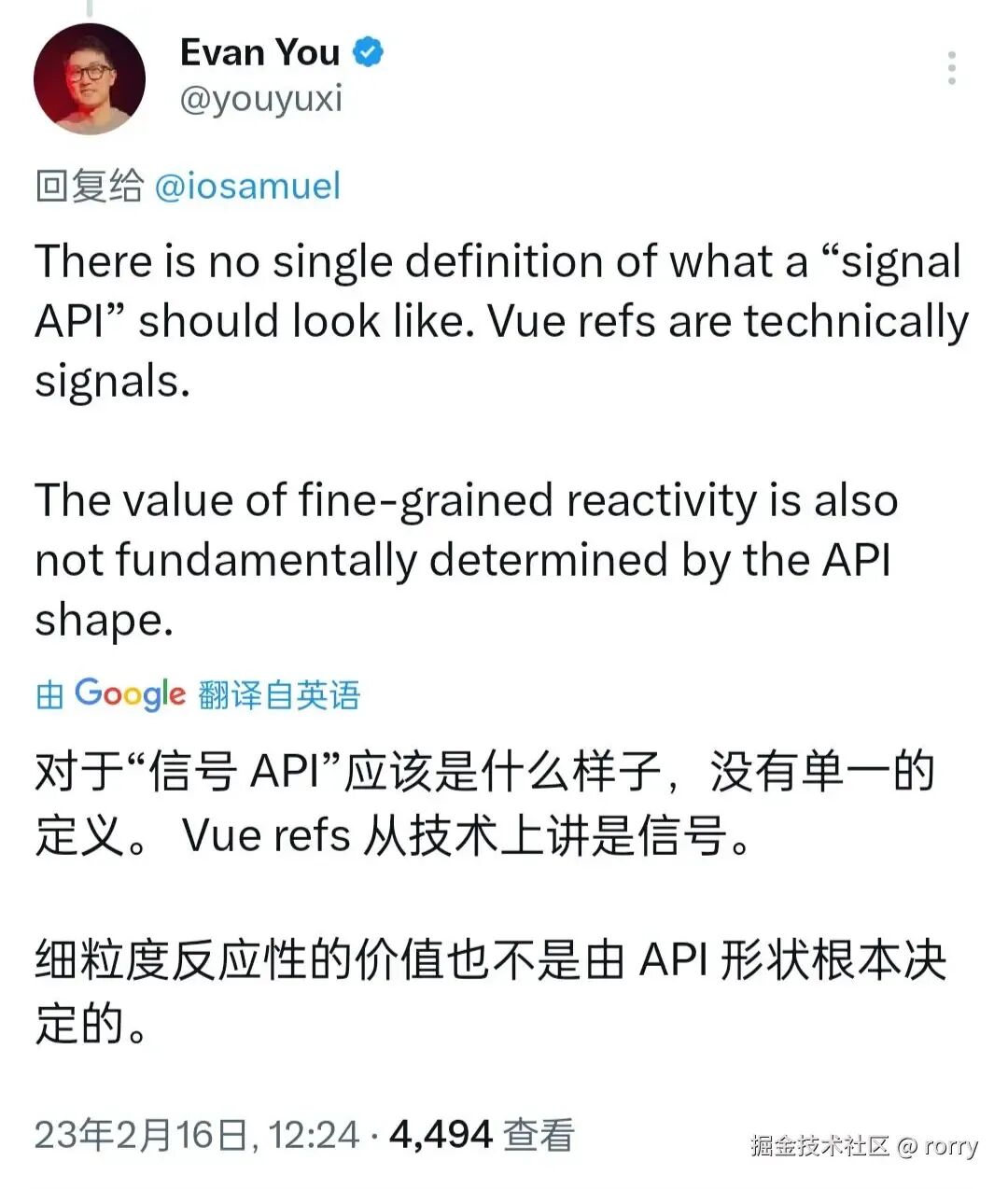 const state = shallowRef({ count: 1 })// 不会触发更改state.value.count = 2// 会触发更改state.value = { count: 2 }// signal setter 更新整个对象const [count, setCount] = createSignal({ count: 1 })setCount({ count: count().count + 1})在 Vue 中利用 shallowRef 可以实现相同效果的 Signal API 链接: