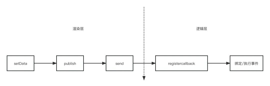 用户点击相应 DOM 时,Exparser 组件系统接收到这个事件,然后开始执行回调。回调函数在逻辑层,事件的触发在渲染层,此时,小程序会通过 setData 发送数据到逻辑层,这个时候 WeixinJSBridge 就派上用场了,渲染层调用 publish 方法发送数据,逻辑层通过 registercallback 进行监听,并执行相应的回调。此时,渲染层到逻辑层的通信流程结束。