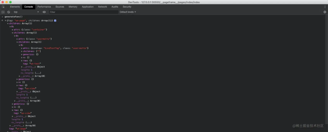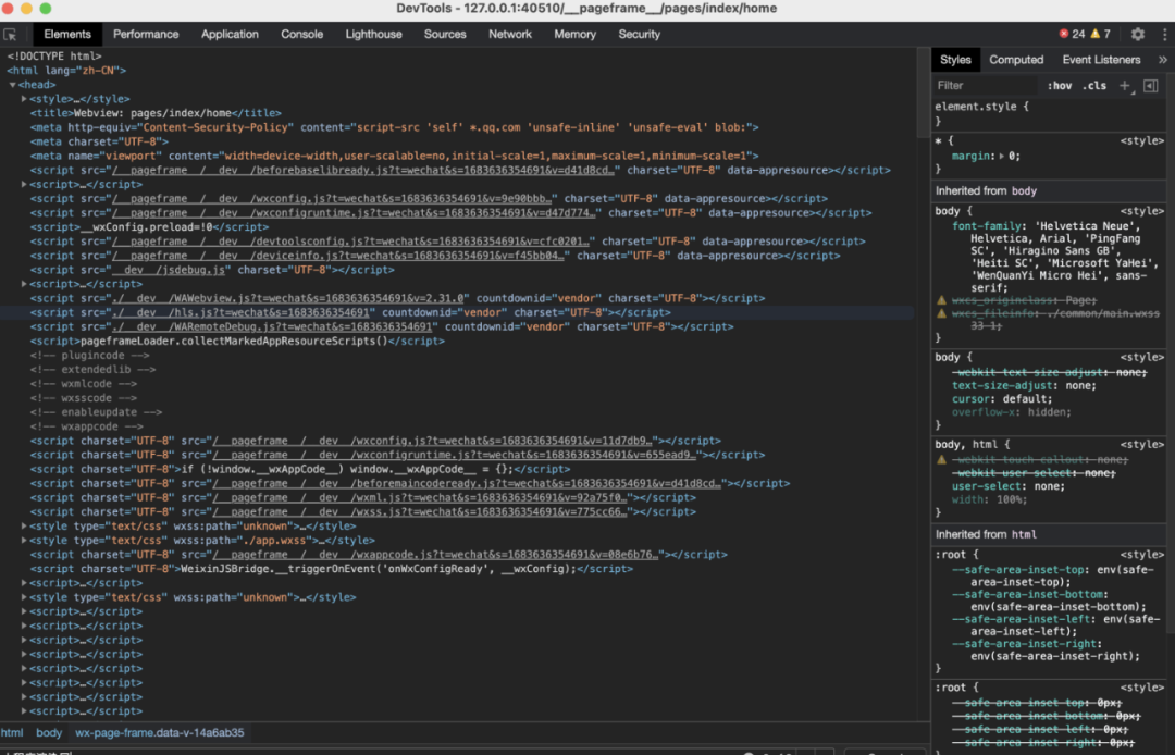 我们在打开 pages/index/index 视图页面时,发现 DOM 中多加载了一个__pageframe__/pageframe.html 的视图层。这个视图层的作用正是小程序提前为一个新的页面层准备的。小程序每个视图层页面内容都是通过 pageframe.html 模板来生成的,包括小程序启动的首页。