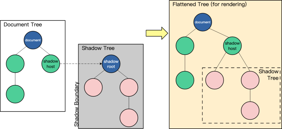 shadow DOM 允许将隐藏的 DOM 树附加到常规的 DOM 树中 - 它以 shadow root 节点为起始根节点,在根节点的下方,可以是任意元素,和普通的 DOM 一样。