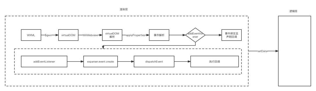 开发者在 DOM 上通过 @click 绑定事件,WXML 文件被编译的时候,会通过 $gwx 函数生成虚拟 DOM,然后小程序执行的时候渲染层底层基础库会对虚拟 DOM 进行解析,事件绑定最终会以 attr 属性的形式生成到虚拟 DOM 中,所以底层基础库通过 applyPropeties 解析事件并通过 addEventListener 绑定到相应 DOM 并声明回调。