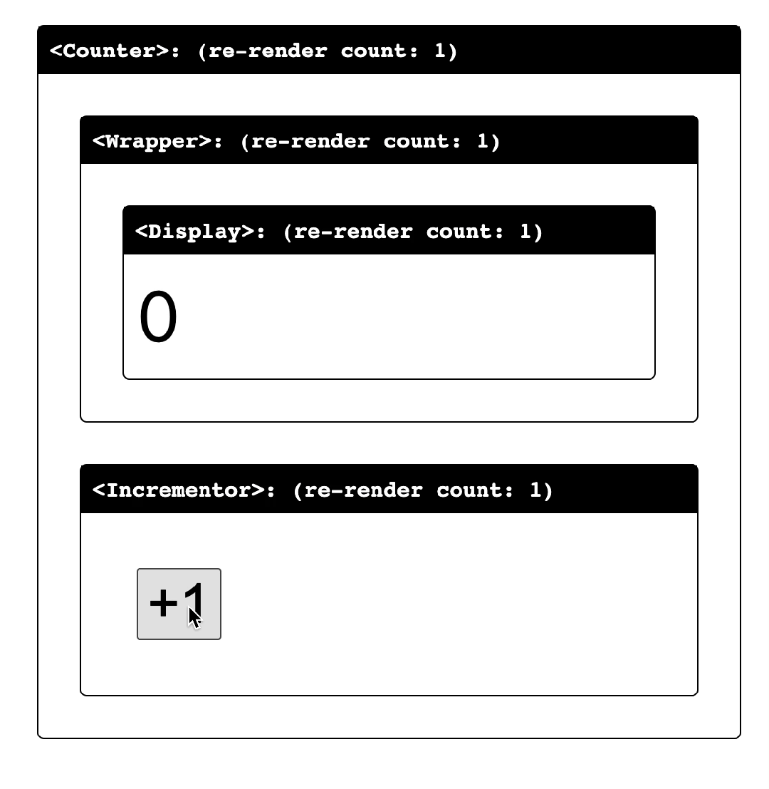 import * as React from 'react';import { useState } from 'react';export default function Counter() { const [count, setCount] = useState(0); return ( <section> <h1><Counter>: {appCounter()}</h1> <Wrapper value={count} /> <Incrementor setCount={setCount} /> </section> );}function Wrapper({ value }: { value: number }) { return ( <section> <h1><Wrapper>: {wrapperCounter()}</h1> <Display value={value} /> </section> );}function Display({ value }: { value: number }) { return ( <section> <h1><Display>: {displayCounter()}</h1> <main>{value}</main> </section> );}function Incrementor({ setCount,}: { setCount: (fn: (v: number) => number) => void;}) { return ( <section> <h1><Incrementor>: {incrementorCounter()}</h1> <button onClick={() => setCount((v) => v + 1)}>+1</button> </section> );}const appCounter = makeCounter();const wrapperCounter = makeCounter();const displayCounter = makeCounter();const incrementorCounter = makeCounter();function makeCounter() { let count = 0; return () => `(re-render count: ${++count})`;}示例效果如下: