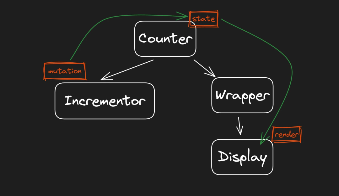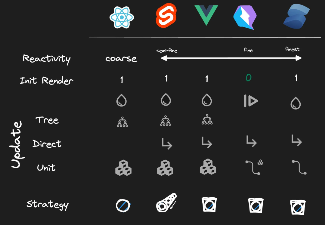 Angular、React、Svelte 和 Vue 在传播对状态的更改时遵循组件层次结构。(Svelte 和 Vue 也可以直接进行组件更新,但这些并不是 “开箱即用” 的)而且这些更新始终发生在组件级别。