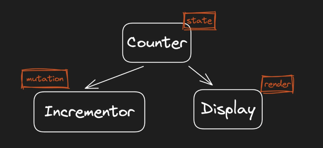 这个例子比较简单。在实际的应用中,状态、事件和绑定并不总是在同一个组件中。因此,我们将示例分解成更细粒度的组件,以展示状态存储(Counter)、状态修改(Incrementor)和状态绑定(Incrementor)是如何跨多个组件进行分布的。