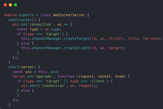 **第一步:**启动一个 node 服务作为中转服务器,然后创建 webSocket 服务用来连接客户端和远程调试端。