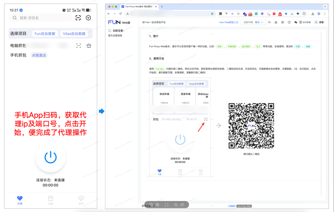 用户可以通过手机安装的 App 扫描页面上二维码,建立连接,也可以直接在手机 WIFI 代理设置中输入固定的代理 IP 和端口号。