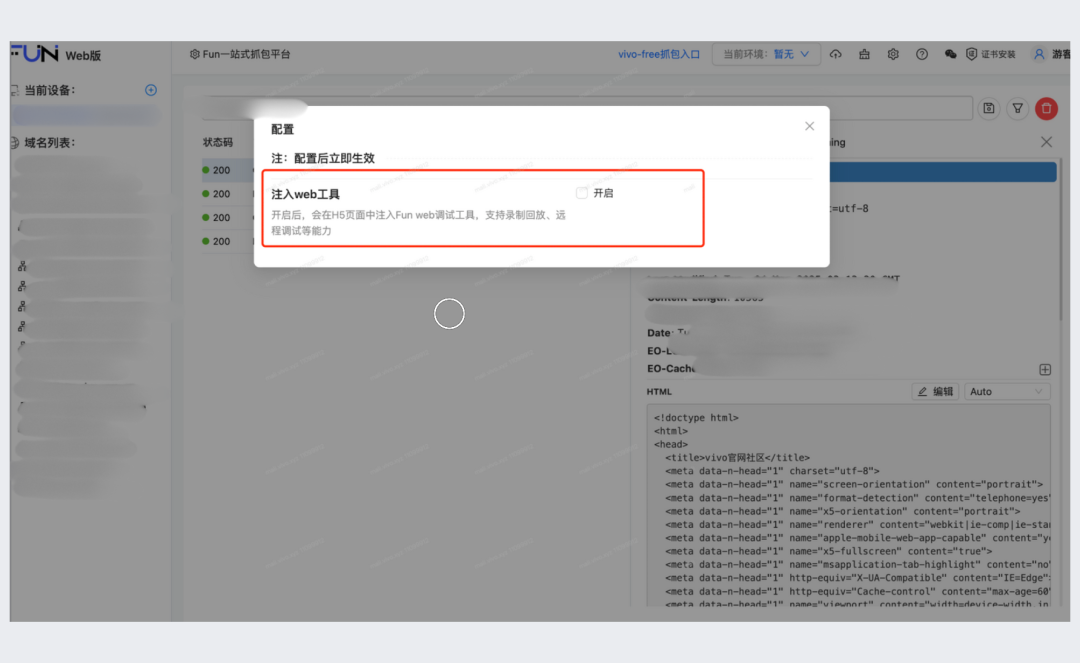 我们还在抓包工具中集成了上面的录制回放工具和远程调试工具,只需要打开开关,便会去识别入口 html,动态注入工具的 sdk,并进行初始化,这样用户再次刷新页面时,页面中便会出现工具的悬浮球。