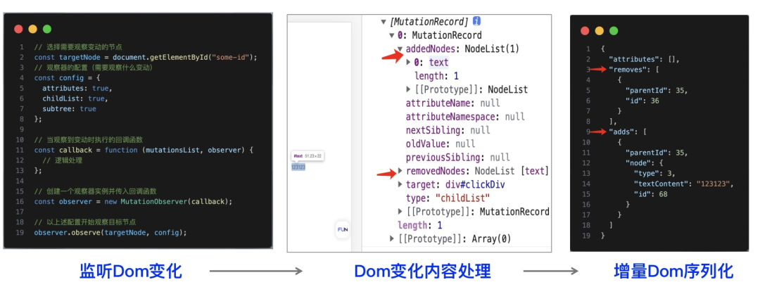 Observer 监听器监控页面的各种变化,如 DOM 的增删改、鼠标移动、滚动以及页面大小调整等,当这些变化发生时,会将变化信息序列化为 JSON 格式的数据并存储起来。