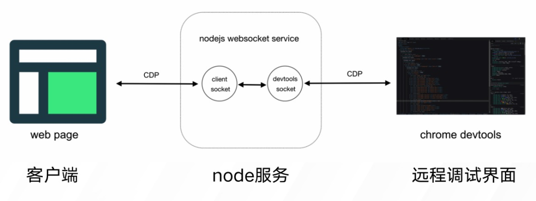 远程调试工具主要包括三个部分:客户端,中转服务,远程调试端 (devtools)。