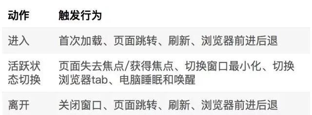 我们可以把一个页面生命周期抽象为三个动作:「进入」、「活跃状态切换」、「离开」