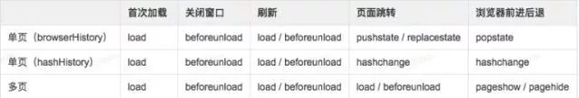 对于常规页面的 首次加载、页面关闭、刷新 等操作都可以通过 window.onload 和 window.onbeforeunload 事件来监听页面进入和离开,浏览器前进后退可以通过 pageshow 和 pagehide 处理。