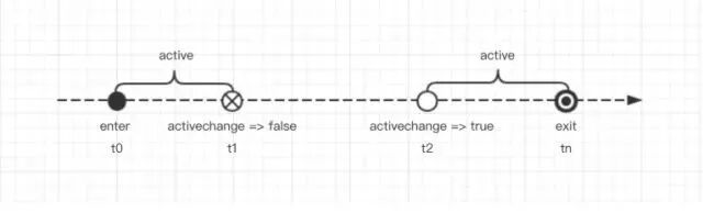 如下图,计算页面停留时长既如何监控这三个动作,然后在对应触发的事件中记录时间戳,比如要统计活跃停留时长就把 active 区间相加即可,要统计总时长既 tn -t0 。