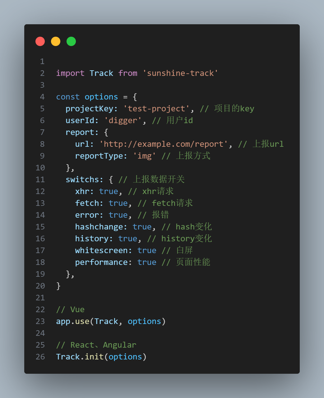 sunshine-track 应用于前端监控, 基于 行为上报,实现了 用户行为、错误监控、页面跳转、页面白屏检测、页面性能检测等上报功能。适用于 Vue、React、Angular 等框架