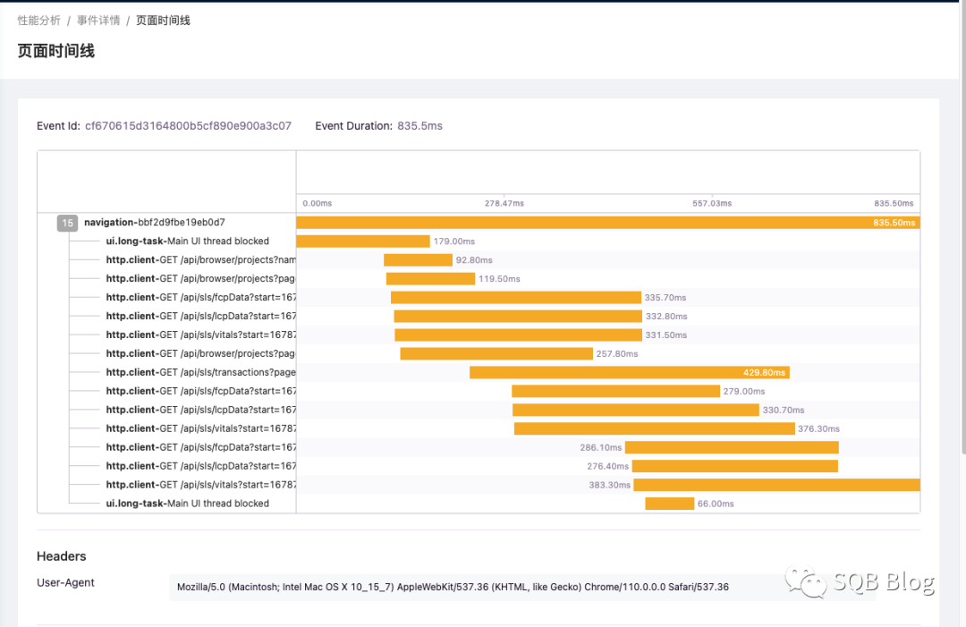 那错误数据收集完,该收集页面性能相关数据了。同样是监听页面事件,当页面加载的时候,在客户端计算好各个性能指标。页面加载的过程中还有很多事件,比如资源的加载、页面的渲染、网络请求、和交互事件等。这些都是属于 tracing 范畴的数据,可以做成 Timeline 时间线,更好地帮助用户发现整个时序内,什么时刻发生了什么操作,各个操作之间的父子关系等,在这时序内的一系列操作就相当于一个事务,所有需要发送整个事务。