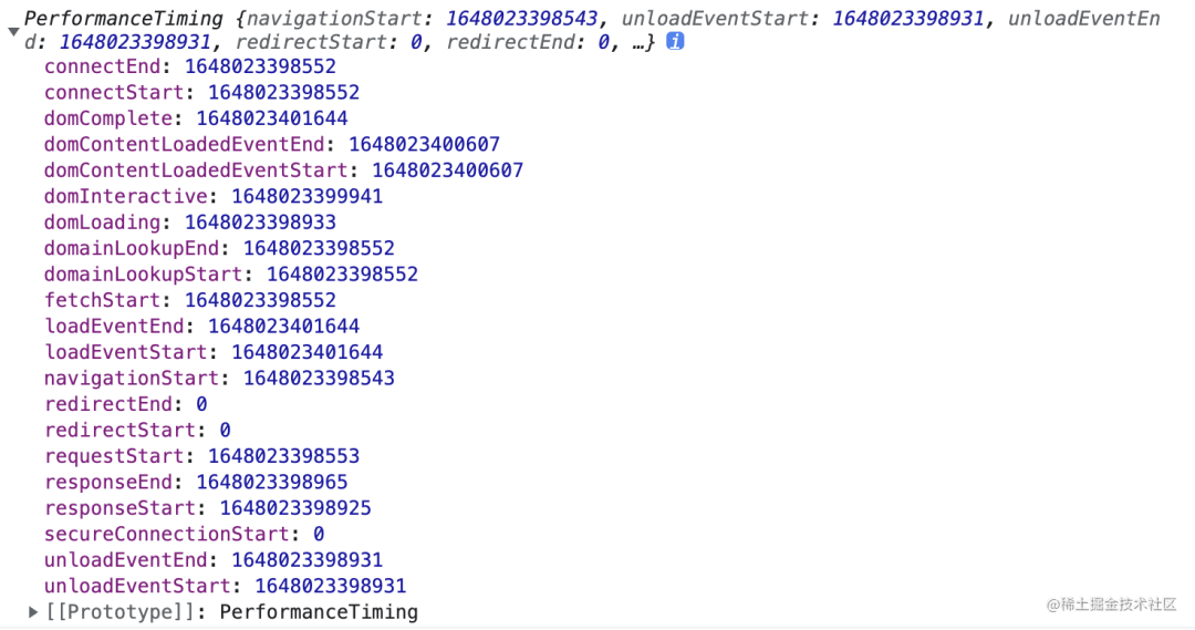 | responseStart | 返回浏览器从服务器收到(或从本地缓存读取)第一个字节时的 Unix 毫秒时间戳 |