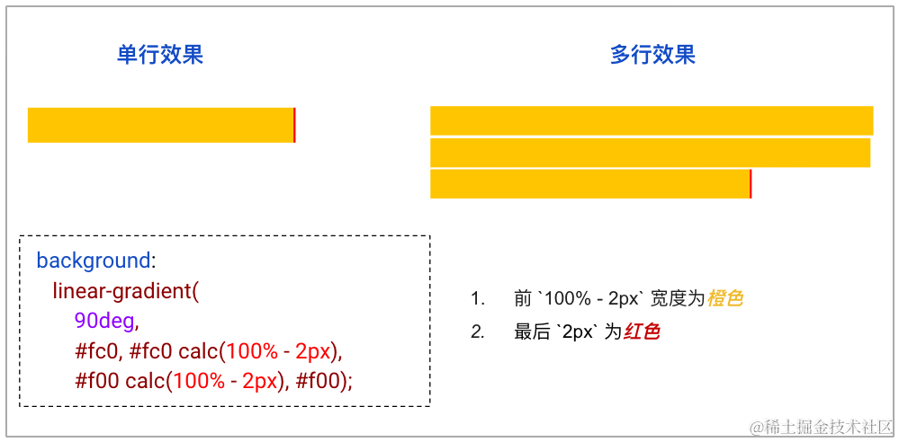 <p id="content"></p>p { display: inline; background: linear-gradient(90deg, #fc0, #fc0 calc(100% - 2px), #f00 calc(100% - 2px), #f00);}其中核心的背景代码 background: linear-gradient(90deg, #fc0, #fc0 calc(100% - 2px), #f00 calc(100% - 2px), #f00) 表达的含义就是前 100% - 2px 宽度为橙色,最后 2px 为红色。
