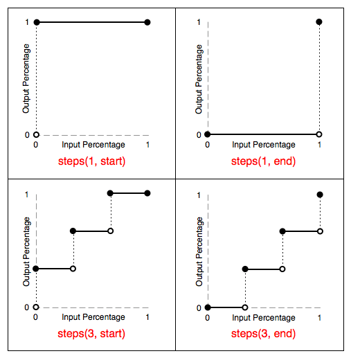 两个参数第一个参数接受一个整数值,表示两个关键帧之间分几步完成第二个参数有两个值 start or end。默认值为 endstep-start 等同于 step(1, start)。step-end 等同于 step(1, end)