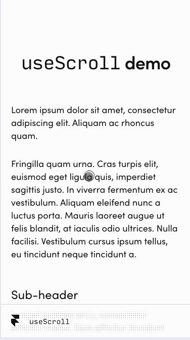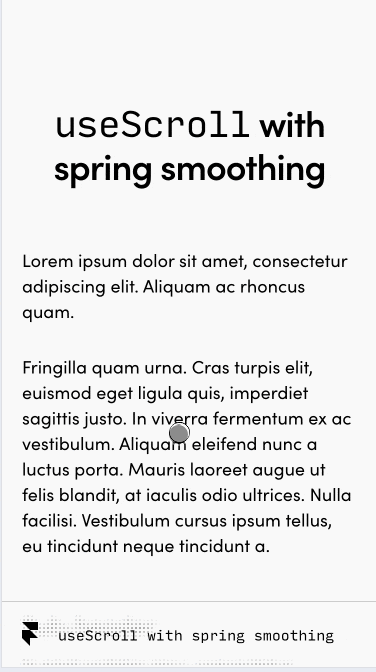 import { LoremIpsum } from "./components/LoremIpsum";import { motion, useScroll } from "framer-motion";export default function App() { const { scrollYProgress } = useScroll(); return ( <> <motion.div class style={{ scaleX: scrollYProgress }} /> <h1> <code>useScroll</code> demo </h1> <LoremIpsum /> </> );}i