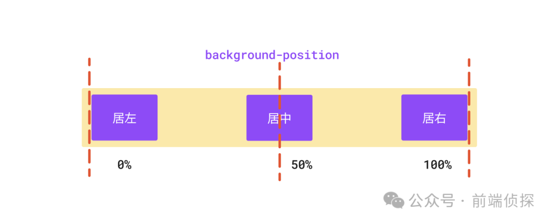 给定背景图像位置的百分比偏移量是相对于容器的。值 0% 表示背景图像的左(或上)边界与容器的相应左(或上)边界对齐,或者说图像的 0% 标记将位于容器的 0% 标记上。值为 100% 表示背景图像的 右(或 下)边界与容器的 右(或 下)边界对齐,或者说图像的 100% 标记将位于容器的 100% 标记上。因此 50% 的值表示水平或垂直居中背景图像,因为图像的 50% 将位于容器的 50% 标记处。类似的,
