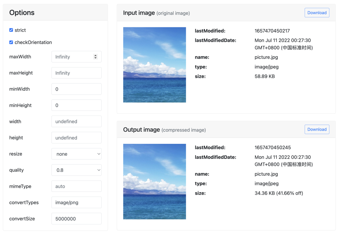 JavaScript 图像压缩器。使用浏览器原生的 canvas.toBlob API 来做压缩工作,即有损压缩,异步压缩,在不同的浏览器有不同的压缩效果。一般在客户端上传之前使用这个来预压缩图片。