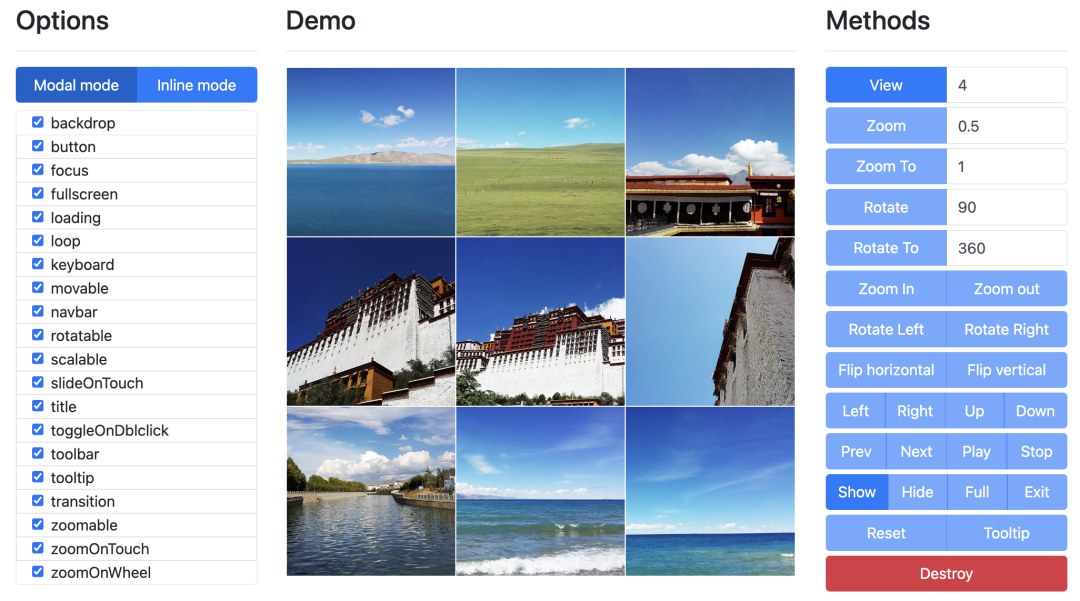 viewerjs 是一个 JavaScript 图像查看器,支持 52 个查看选项、23 种操作方法、17 个事件、旋转、移动、缩放等。