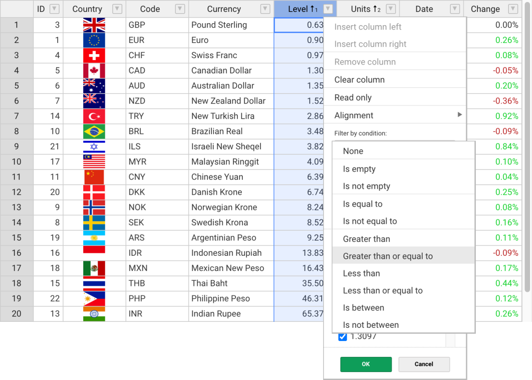 Handsontable 是一个具有电子表格外观的 JavaScript 数据网格组件。适用于 React、Angular 和 Vue。它结合了数据网格功能和类似电子表格的 UX。它提供数据绑定、数据验证、过滤、排序和 CRUD 操作。