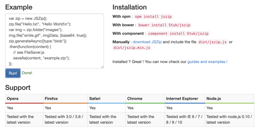 JSZip 是一个使用 JavaScript 创建、读取和编辑 .zip 文件的库,具有简单的 API。