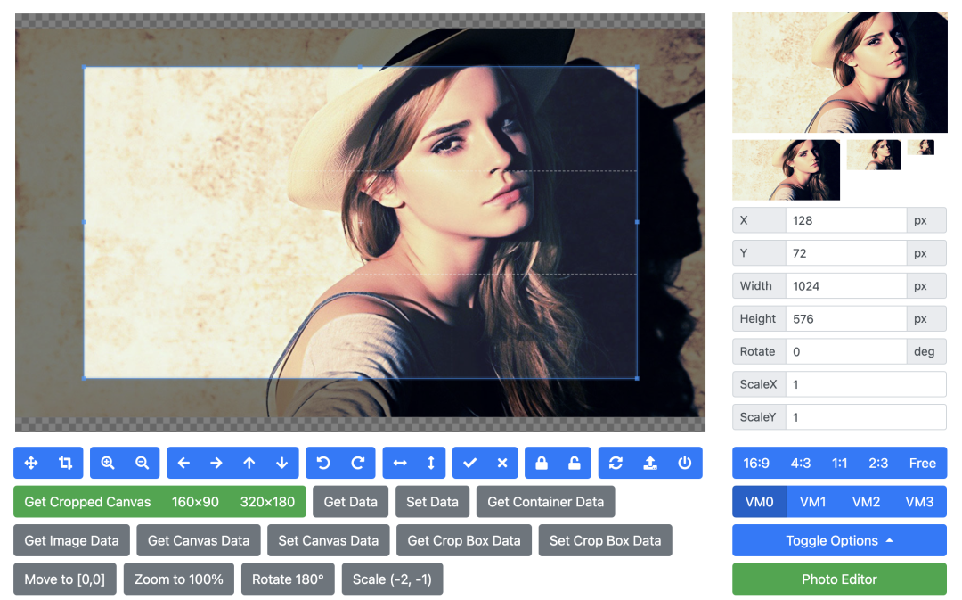 cropperjs 是一个 JavaScript 图像裁剪器,支持 29 个裁剪选项、27 种方法、6 个事件、缩放、旋转等。