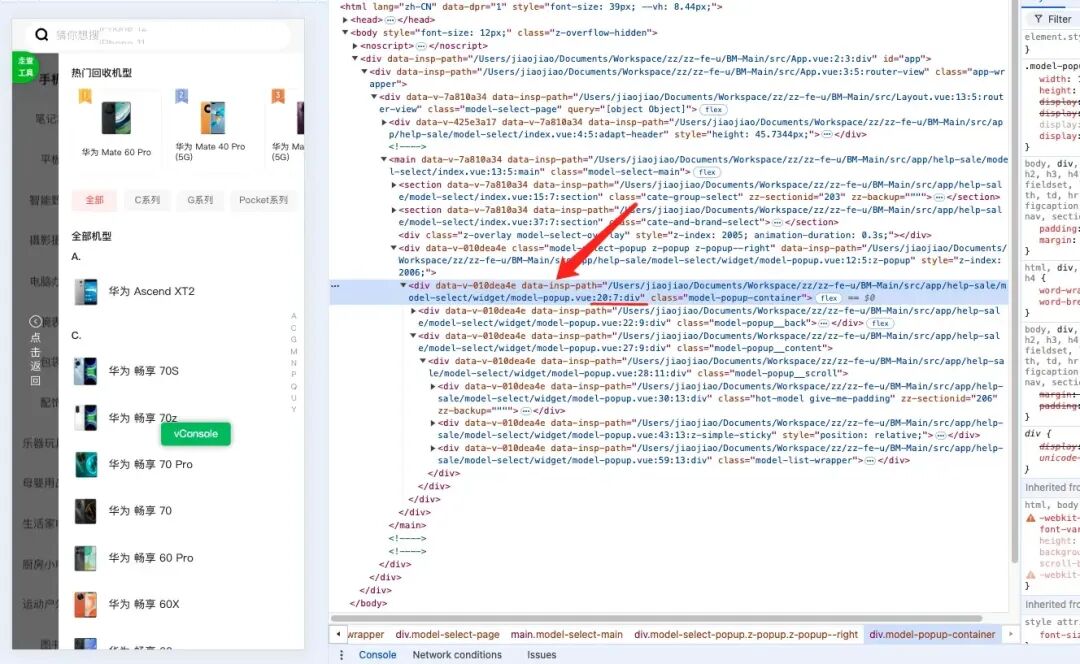 import MagicString from 'magic-string';import type { TemplateChildNode, NodeTransform, ElementNode,} from '@vue/compiler-dom';import { parse, transform } from '@vue/compiler-dom';export function transformVue( content: string, filePath: string, escapeTags: EscapeTags) { const s = new MagicString(content); // parse 方法解析vue 模版为ast 对象 const ast = parse(content, { comments: true, }); ... if (pugMap.has(filePath) && templateNode) { ... } else { transform(ast, { nodeTransforms: [ ((node: TemplateChildNode) => { if ( !node.loc.source.includes(PathName) && node.type === VueElementType && !isEscapeTags(escapeTags, node.tag) ) { // 向 dom 上添加一个带有 filepath/row/column 的属性 const insertPosition = node.loc.start.offset + node.tag.length + 1; const { line, column } = node.loc.start; // 规则: 注入的路径名称data-insp-path = 路径:行:列:html标签 const addition = ` ${PathName}="${filePath}:${line}:${column}:${ node.tag }"${node.props.length ? ' ' : ''}`; s.prependLeft(insertPosition, addition); } }) as NodeTransform, ], }); } return s.toString();}上面 vue/jsx 编译完成后,其实相当于在源代码基础上为每个 dom 注入了一个 data-insp-path 属性,最终元素到页面上,对应的 dom 就会添加一个这样的属性,如下图所示: