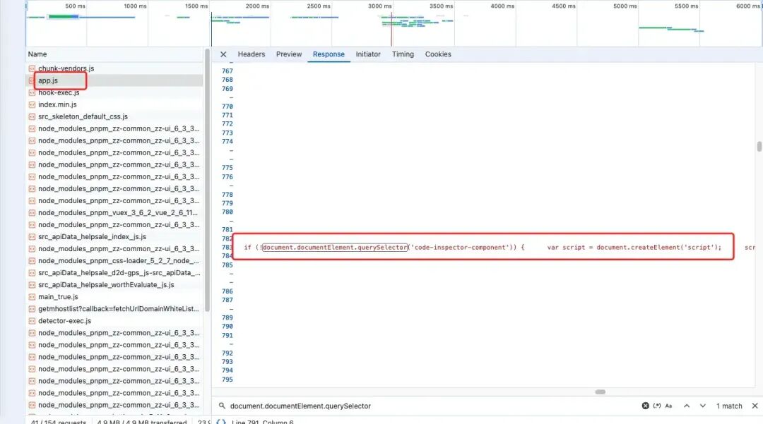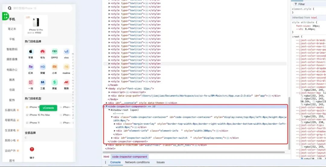 import { startServer } from './server';let compatibleDirname = '';if (typeof __dirname !== 'undefined') { compatibleDirname = __dirname;} else { compatibleDirname = dirname(fileURLToPath(import.meta.url));}// 这个路径是根据打包后来的,client.umd.js 是啥,后面说export const clientJsPath = path.resolve(compatibleDirname, './client.umd.js');const jsClientCode = fs.readFileSync(clientJsPath, 'utf-8');export function getInjectedCode(options: CodeOptions, port: number) { let code = `'use client';`; code += getEliminateWarningCode(); if (options?.hideDomPathAttr) { code += getHidePathAttrCode(); } code += getWebComponentCode(options, port); return `/* eslint-disable */\n` + code.replace(/\n/g, '');}export function getWebComponentCode(options: CodeOptions, port: number) { const { hotKeys = ['shiftKey', 'altKey'], showSwitch = false, hideConsole = false, autoToggle = true, behavior = {}, ip = false, } = options || ({} as CodeOptions); const { locate = true, copy = false } = behavior; return `;(function (){ if (typeof window !== 'undefined') { if (!document.documentElement.querySelector('code-inspector-component')) { var script = document.createElement('script'); script.setAttribute('type', 'text/javascript'); script.textContent = ${`${jsClientCode}`}; var inspector = document.createElement('code-inspector-component'); inspector.port = ${port}; inspector.hotKeys = '${(hotKeys ? hotKeys : [])?.join(',')}'; inspector.showSwitch = !!${showSwitch}; inspector.autoToggle = !!${autoToggle}; inspector.hideConsole = !!${hideConsole}; inspector.locate = !!${locate}; inspector.copy = ${typeof copy === 'string' ? `'${copy}'` : !!copy}; inspector.ip = '${getIP(ip)}'; document.documentElement.append(inspector); // 将自定义组件插入到页面上 } }})();`;}export async function getCodeWithWebComponent( options: CodeOptions, file: string, code: string, record: RecordInfo) { // start server await startServer(options, record); recordEntry(record, file); // 判断js文件,且是入口js文件,注入代码 if ( (isJsTypeFile(file) && getFilePathWithoutExt(file) === record.entry) || file === AstroToolbarFile ) { ... } else { code = `${injectCode};${code}`; } } return code;}经过这一步,把自定义组件代码 注入到了 app.js 中,在页面加载之后,我们可以看到页面上 被注入了 shadow dom 自定义组件
