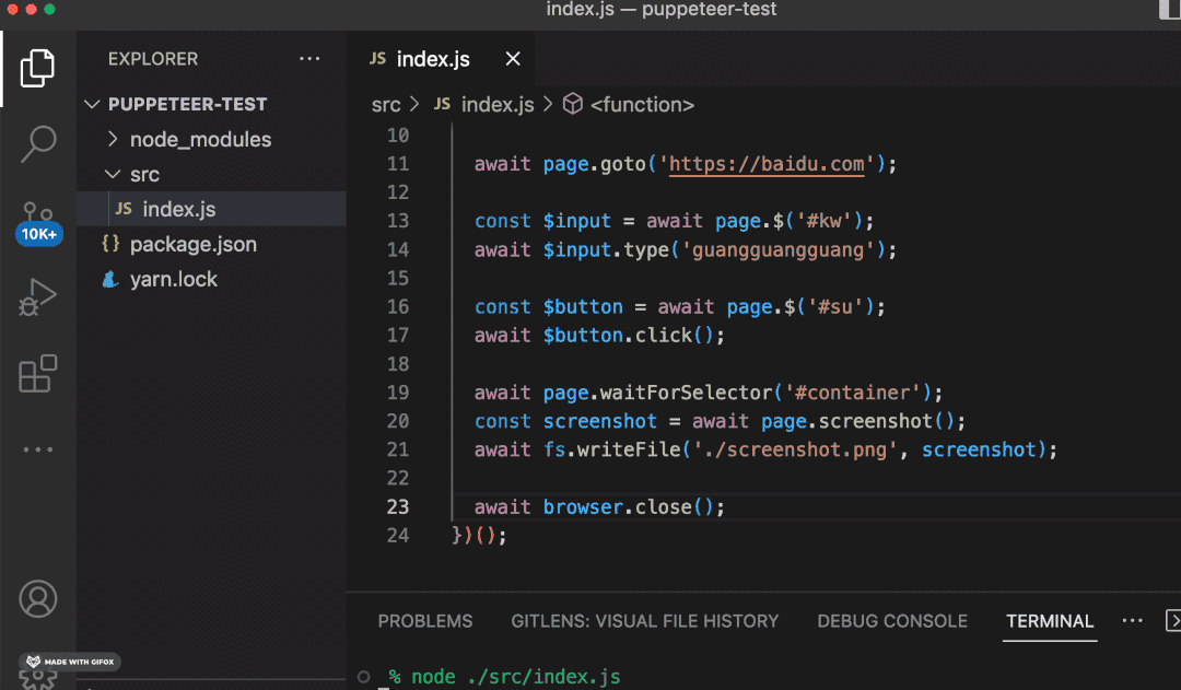 const puppeteer = require('puppeteer');const fs = require('fs/promises');(async () => { const browser = await puppeteer.launch({ headless: false }); const page = await browser.newPage(); await page.goto('https://baidu.com'); const $input = await page.$('#kw'); await $input.type('guangguangguang'); const $button = await page.$('#su'); await $button.click(); await page.waitForSelector('#container'); const screenshot = await page.screenshot(); await fs.writeFile('./screenshot.png', screenshot); await browser.close();})();我们 launch 了一个浏览器,打开一个标签页,访问 baidu,在输入框输入一些内容,然后点击搜索按钮,等页面出现结果就截下图存到本地文件,然后关闭浏览器。