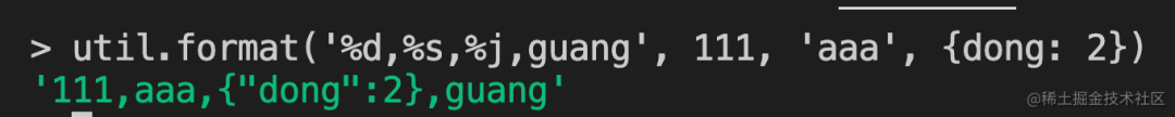 util.format 是格式化字符串用的,有一些占位符,%d 是数字、%s 是字符串、%j 是 JSON 等: