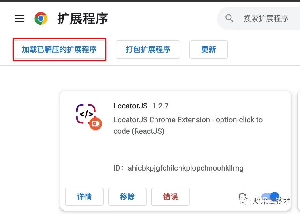 因为我们是采用的 Chrome 插件和 react devtools 进行代码分析。所以必须安装这 2 个插件。react devtools 如果没有安装,可以去 Chrome 插件市场里搜索安装。locatorjs Chrome 插件我们加载开发版本进行代码调试。(进去 Chrome 扩展管理 -> 加载我们项目 apps/extension/build/development_chrome 这个文件夹)