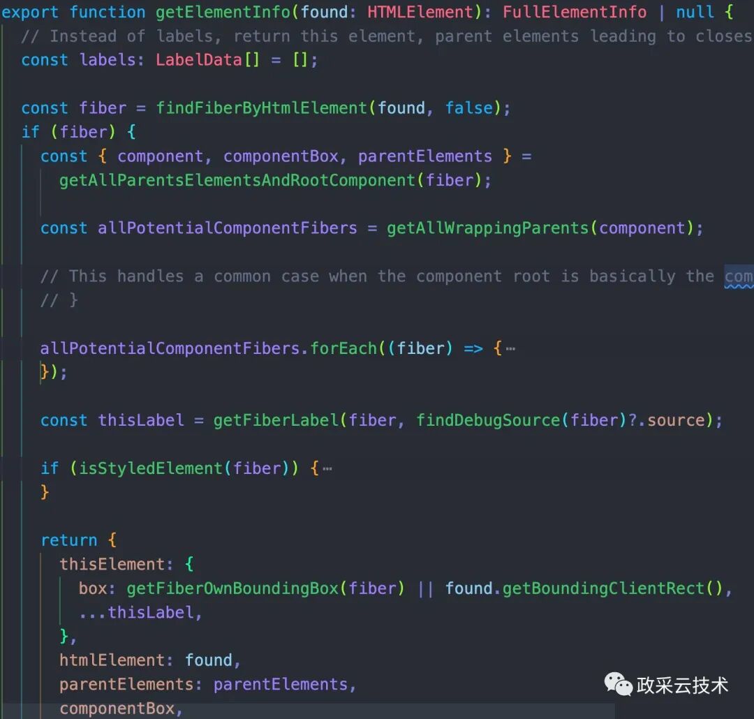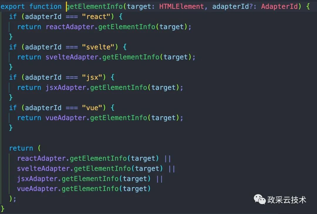 接着我们来看 getElementInfo 这个方法到底做了什么。可以看到,它用来适配器设计模式。根据适配 id 的不同,走不同的逻辑。现在我们来看 react 项目是怎么获取元素信息的。