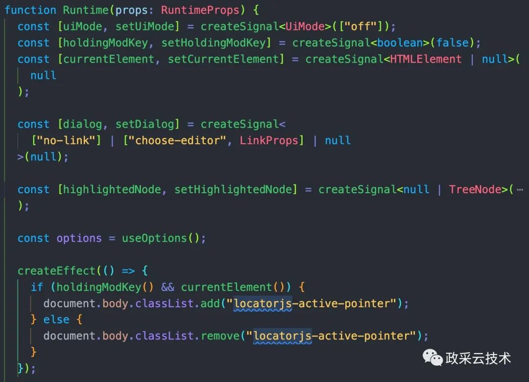 在这个文件中终于看到了真面目,最终渲染的就是 Runtime 这个函数组件。该组件使用了 solidjs。函数最上面是一些变量的声明。