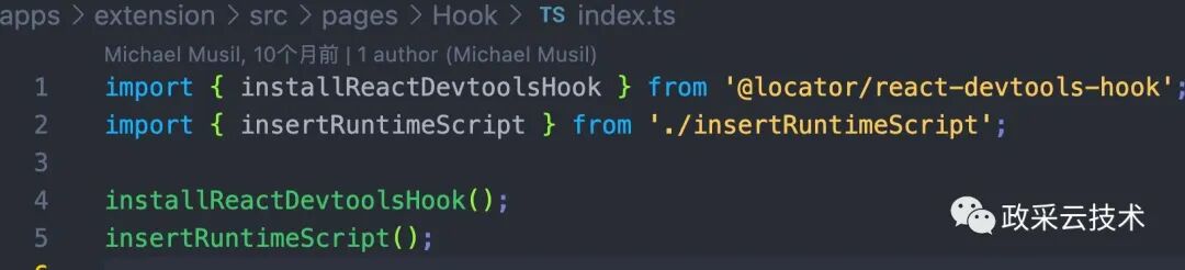 hook.bundle.js 就是 hook.ts 打包之后的文件名,它主要做了 2 件事情,第一,确保 react devtools 已经被安装了;第二,注入 runtime script。