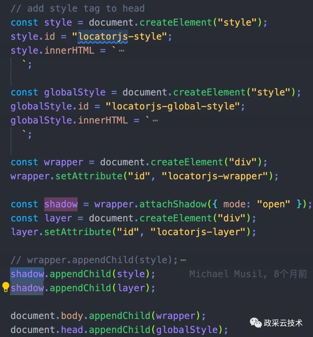 该文件中,它通过 shadow Dom 的方案去添加了一个 locatorjs 自己的全局样式和容器,来隔离 CSS,以免对页面进行影响。